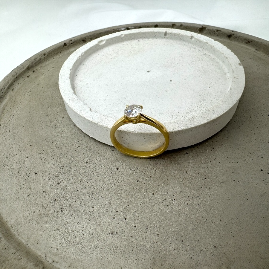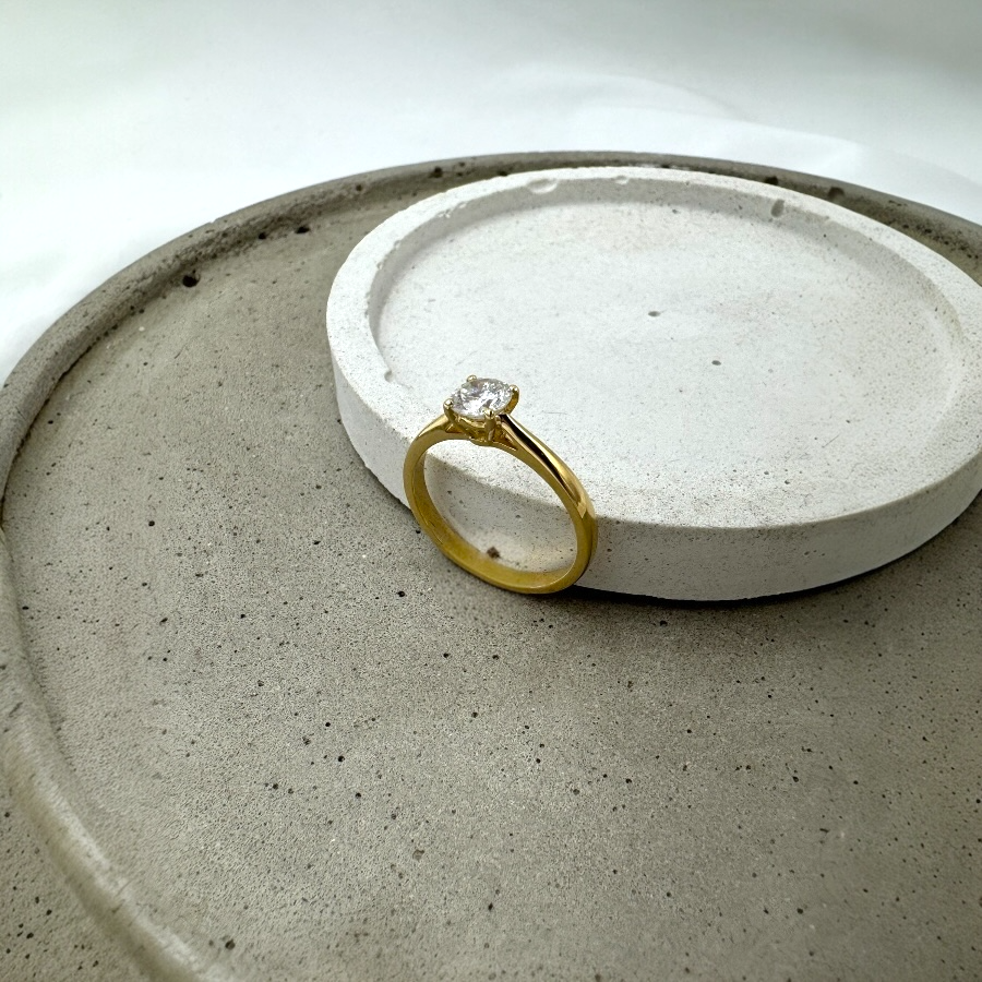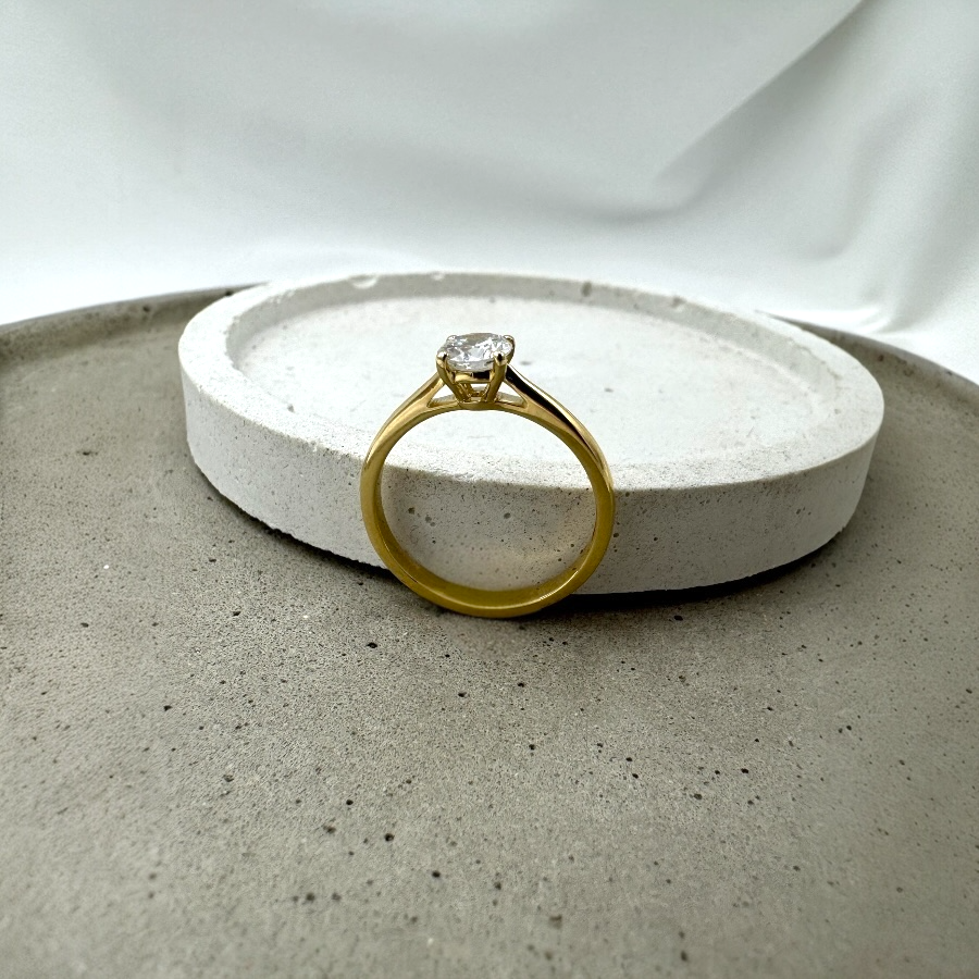 Pierścionek wykonany z żółtego złota próby 585 (14k). Centralnie osadzony naturalny diament w szlifie brylantowym o masie 0,50ct, czystości SI2 i barwie G. Diament posiada certyfikat IGI.