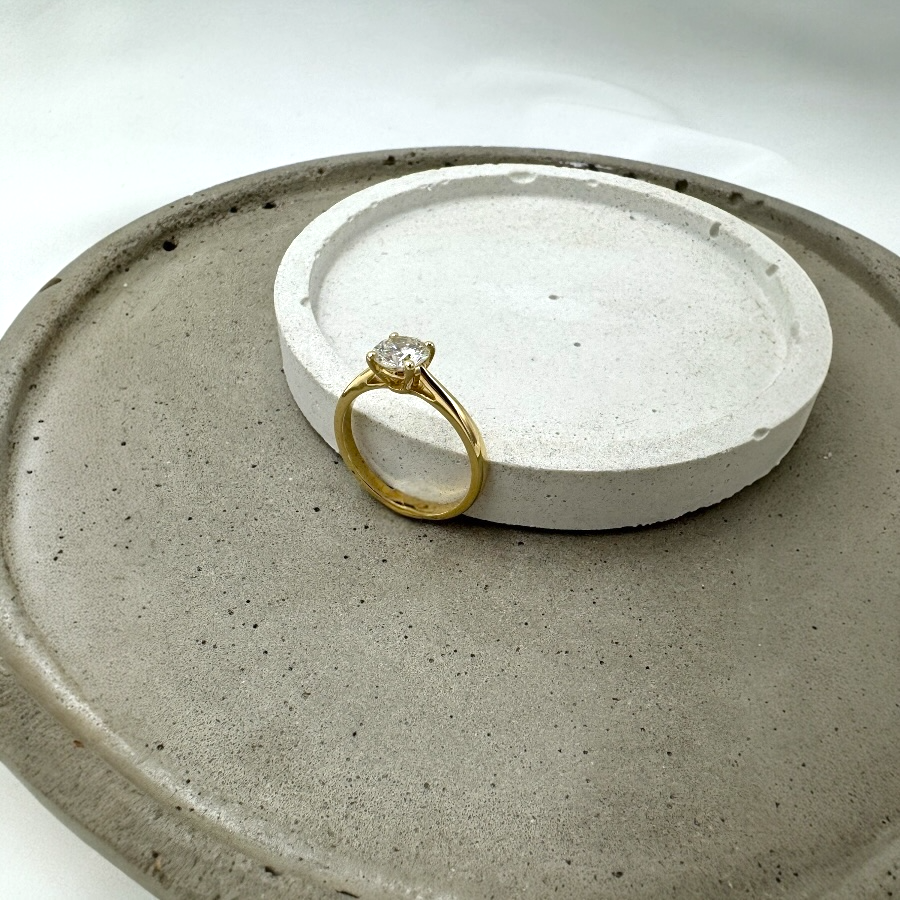 Pierścionek wykonany z żółtego złota próby 585 (14k). Centralnie osadzony naturalny diament w szlifie brylantowym o masie 0,04ct, czystości VS1 i barwie I. Diament posiada certyfikat IGI.
