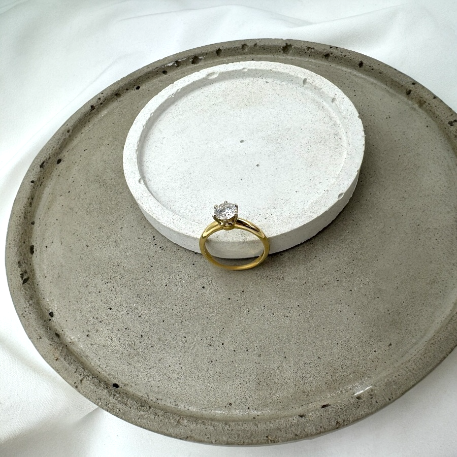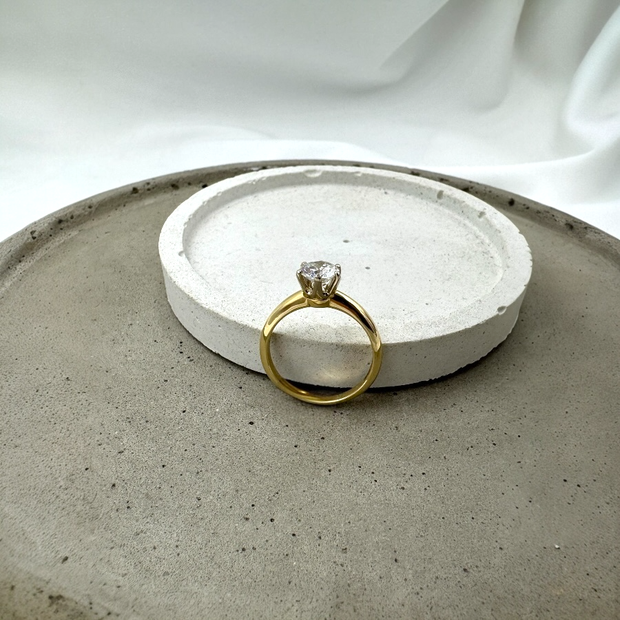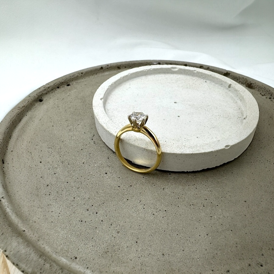 Pierścionek wykonany z żółtego złota próby 585 (14k). Centralnie osadzony naturalny diament w szlifie brylantowym o masie 0,78ct, czystości VS2 i barwie F. Diament posiada certyfikat IGI.