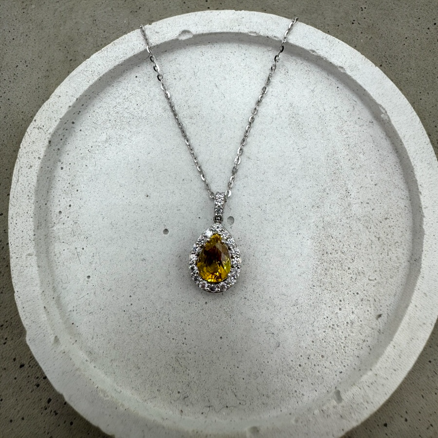 Zawieszka wykonana z białego złota próby 585. Centralnie umieszczony żółty szafir o masie 1.46ct, zdobią diamenty o łącznej masie 0.23ct